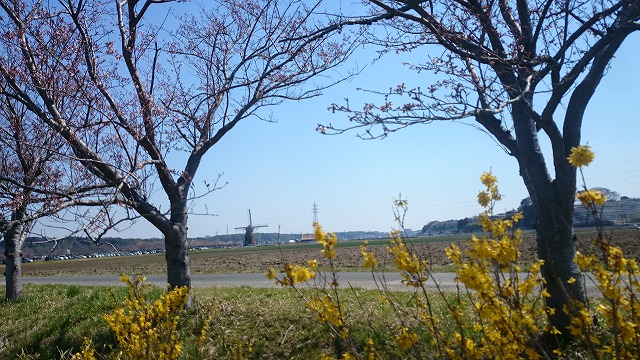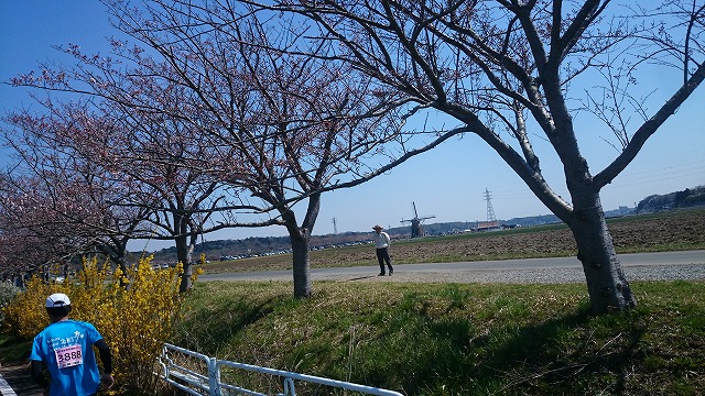 28km付近では、橋を渡り風車に近づきます。この辺りは桜も咲いているのが励みです。全体に写真も少ないもののせめてここだけはと撮影しましたが、なんかすごく遠くて残念な写真ですね。肉眼で見るともっと大きく見えるものの、とはいえ宣材写真のようにどどんと聳え立つ感じでもなく、やや感情のやり場に迷うところではあります。