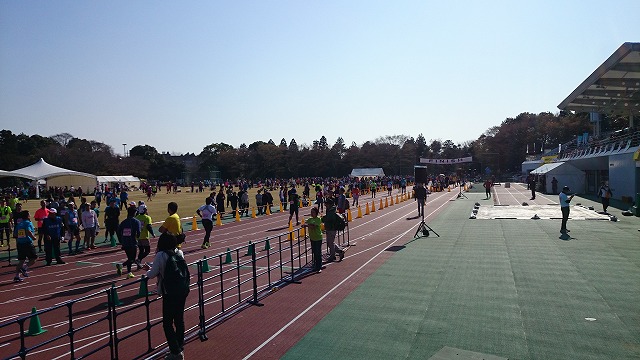 バスは8時過ぎJR佐倉で少し並んだ程度です。8時40分前には着きました。参加賞引き換えや荷物預けはスムーズです。バスで70歳から走り始めた74歳の男性ランナーとお話しでき、会場に着いたら近所でよく会う先輩ランナー(生涯ベストは2時間33分!)に遭遇する展開に盛り上がります。お互い何故にこんなに遠くまで来たのかと。